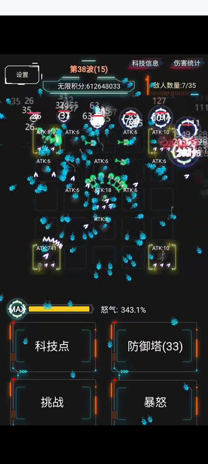 敌人数量超过30个就开启倒计时,结束时若还超过30则游戏结束。不过压力大也是有好处的,科技点挑战会比较有利,只看攻击力够不够。