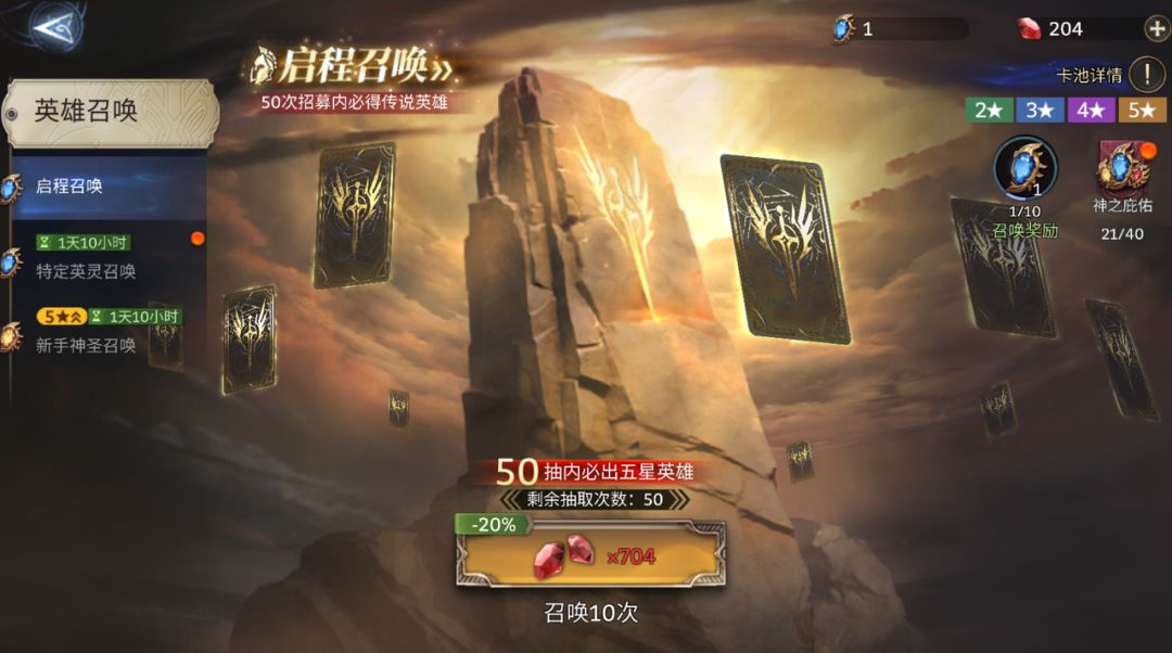 可通过召唤抽取更多的英雄,启程召唤50抽必出五星,建议先攒50抽来获取第一个传说英雄。如果提前出了,就不建议再继续抽(比如前20抽出了,后面30抽就不用管,因为保底用完,没抽很亏)。召唤开启后还会同步开启特定英灵召唤(特定英雄获取概率UP)、新手神圣召唤卡池,特定英灵召唤卡池中的哈苏的开荒强度很高,有条件可以抽一个出来(卡池中有两个英雄获取概率提升,考虑到歪的概率,大概要预备500-800抽)。