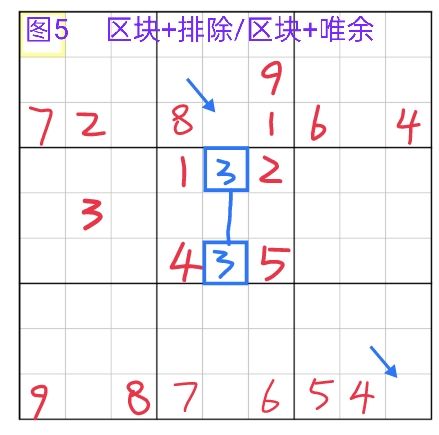 区块也分为行区块/列区块/宫区块,区块有可能同时拥有行宫或者列宫两种属性,也有可能只有一种,根据区块中所有单元格中的位置决定。图4为行/列/宫区块的例子,r45c1的3区块即是列区块也是宫区块(1列/4宫),r34c5的3区块只能看做列区块,r9c89的3区块即是行区块也是宫区块(9行/9宫)。区块能起到什么样的作用呢,当一个数字a在某个区域里行成区块,那么就意味着,a在这个区块内必然会有一个位置填入它,这个区块涉及到的格子,不能有这个数字,否则在区块内就无法再填入a了,所以区块可以帮助排除。图5为区块排除+区块唯余的两则例子,r5c2的3对5宫进行排除后,得出5宫的3区块(r46c5),再对r9排除后得出r9的3的出数位置。同样的区块对r3c5排除后,此格子唯余5。