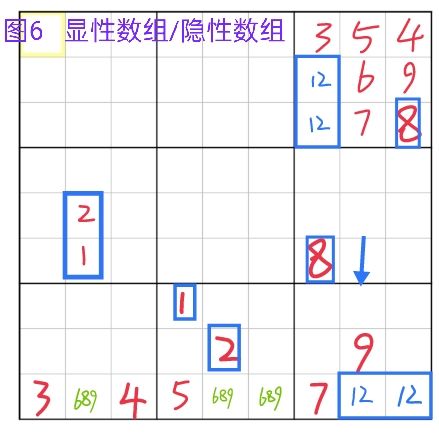 数组是区块的重叠,逻辑跟作用已经在①中解释过了,图6是显性数组/隐性数组的两则例子,因为3宫的其他数字,所以r23c7两格中都只能填入12,构成显性数对。r9是隐性数对的例子,通过r56c2的1/2以及8宫的1/2对r9进行排除后得出r9c89的隐性12数对,此时再根据盘面中其他8的位置可以得出r7c8填8。绿色的689显性三数组是隐性12数对的互补,可以看出9减去隐性数组的阶级减去区域中填入数/提示数的数量总和等于显性数组的阶级(9-2-4=3)。