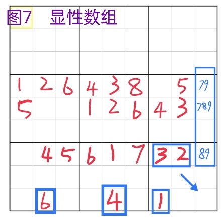 再给出一个显性数组的例子,图7中根据4/5/7行的数字得出显性789三数组,再根据b9的123以及r9的46可得出r9c9唯余5。