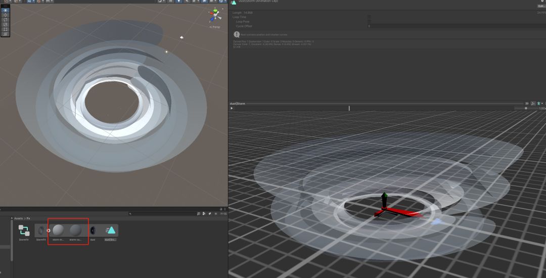 当我把文件导出fbx,随后丢到unity里,我发现风暴旋转的动作资源是没问题的。可以看到风暴在场景里正常旋转。