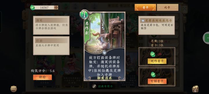 敌方打出装备牌时触发:消灭该装备,并将随机己方手牌中1张费用小于或等于5的妖仙类生灵牌放入己方随机空位