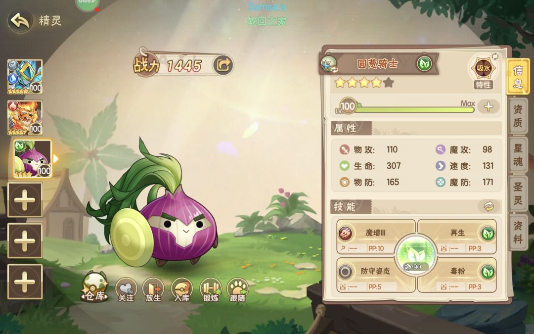 1只吸水特性圆葱骑士100级(风吟村庄园做支线任务解锁捕捉)