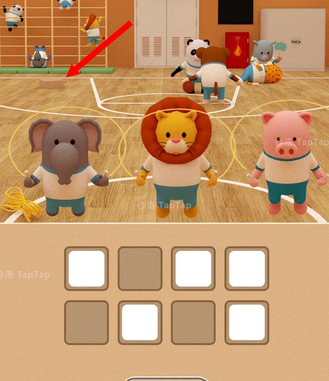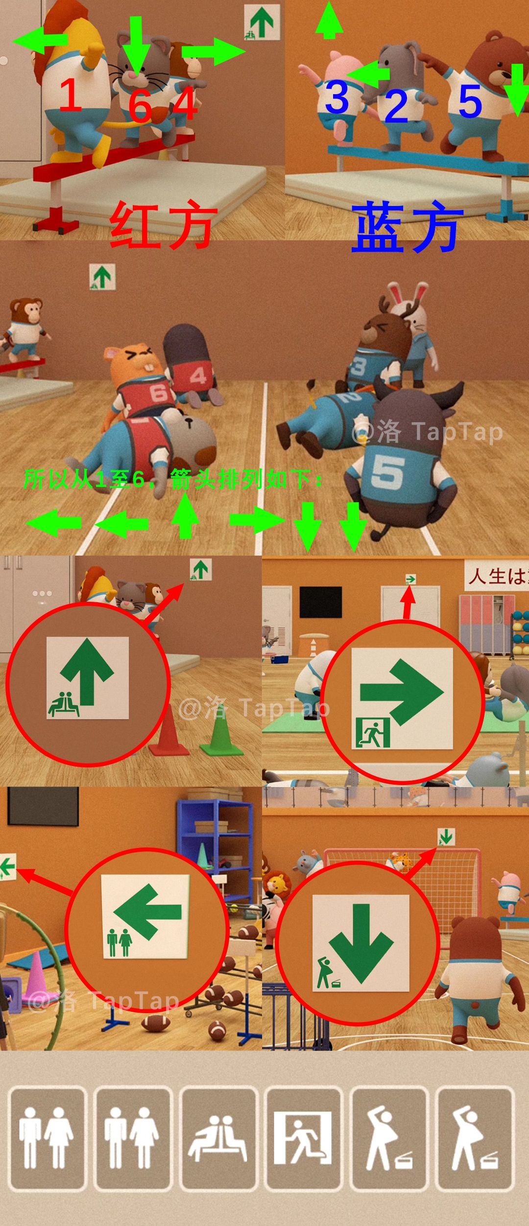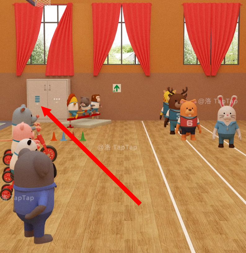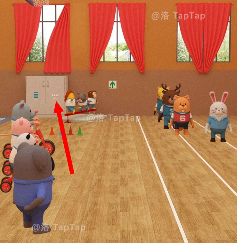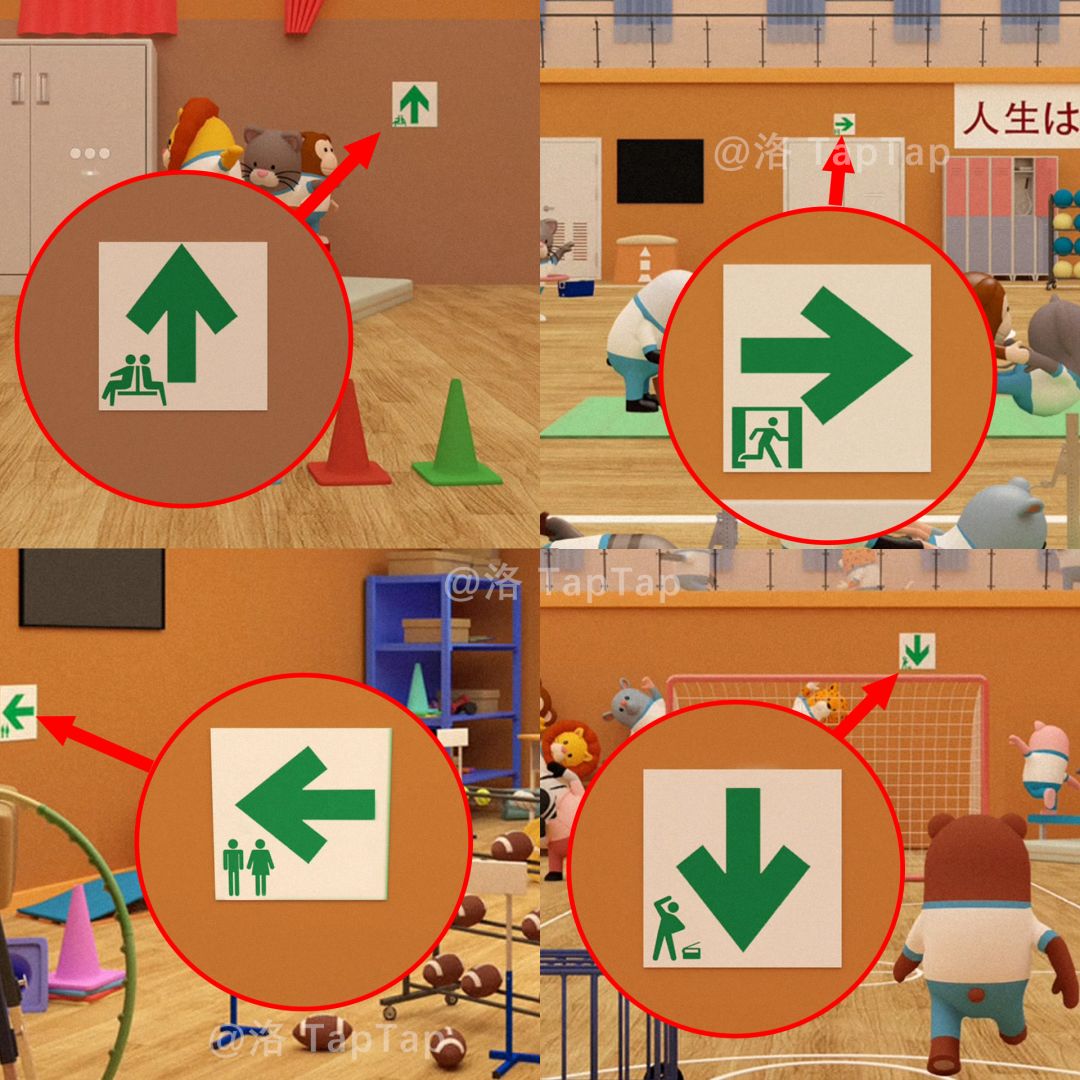 点击体育馆大门,结合【任务9】中累瘫在地同学的号码牌、平衡木上同学们的朝向,以及上方的箭头对应图标,调整大门上的机关;打开大门,结束本章节