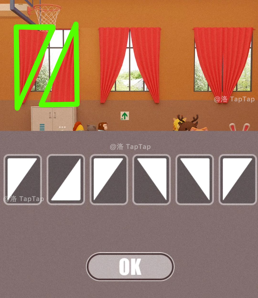 根据田径场上方窗帘类似三角形的形状,调整柜子的机关;打开柜子,获得【绿色篮球】