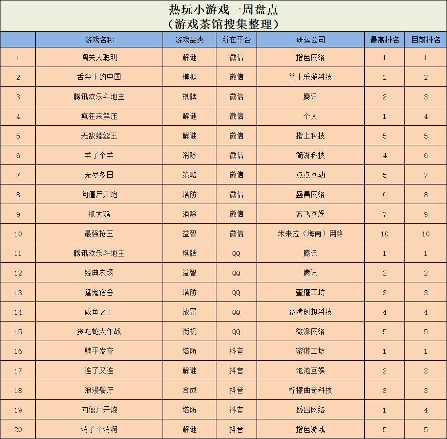 休闲新游周报每周统计微信小游戏、QQ小游戏、抖音小游戏、硬核小游戏以及App Store和Google Play上的新游爆款,并按照分类制作表格,将游戏排名情况等信息公布,希望给到行业同侪帮助。