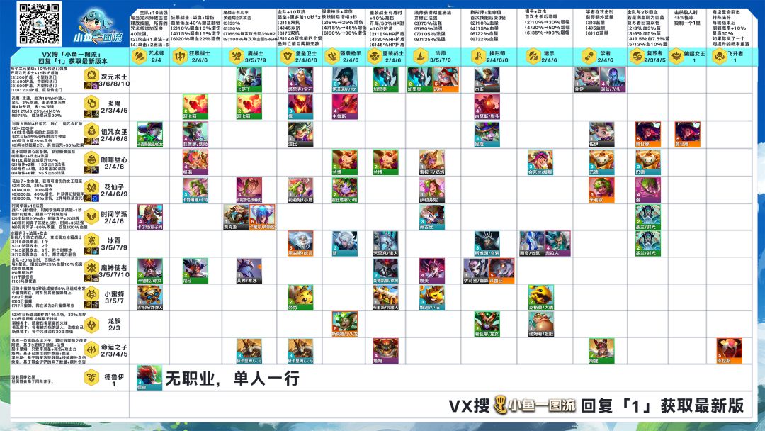 小鱼自制:每个赛季都会出这么一张表,里面包含转职合成、羁绊效果、羁绊阶层、棋子费用、棋子所属羁绊等(羁绊效果是对的,但数值看的大概就好,因为上线正式服后,随版本改动,这张表要频繁改动,会大幅增加我工作量)