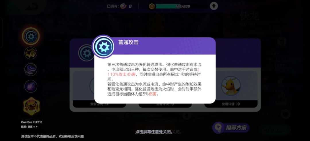 快龙的普通攻击每两次之后都可以使用一次强化普攻攻击,当还是迷你龙时,强化普通攻击只能喷射出水流,命中目标后可以回复少量生命值;进化成哈克龙时,强化普通攻击会在水流,雷电光束中交替使用,雷电光束命中的目标将造成眩晕效果;进化成快龙时,强化普通攻击也会从水流、雷电、火焰之间循环,火焰会附带目标当前剩余生命的百分比伤害。