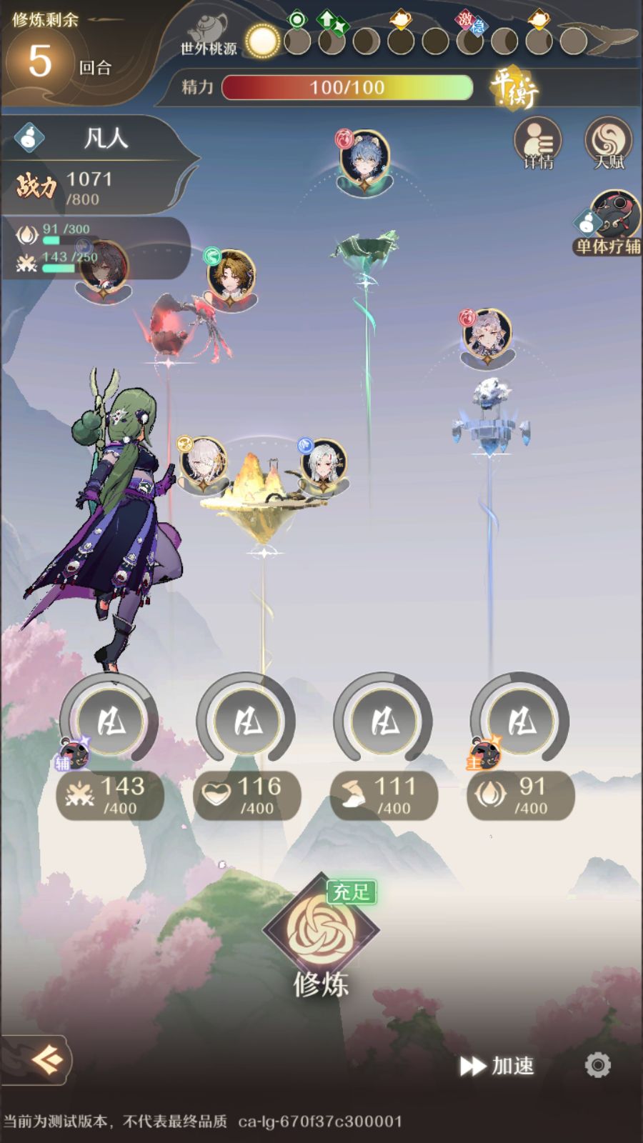 在进入炉内之前,御境大人们可以根据自己的需求,选择想要养成的弟子以及属性职业方向,选定弟子后就可以配上准备好的执念卡啦~而在进入炉内后,养成弟子主要是通过修炼和奇遇,辅以丹药协助的方式,通过各类随机选项进行提升修炼。