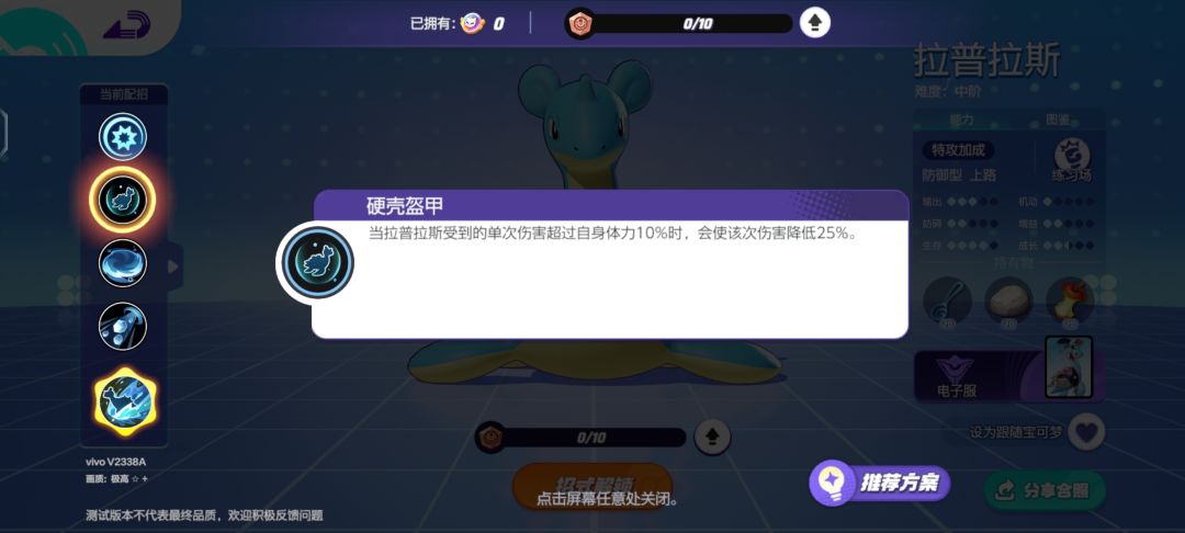 拉普拉斯的被动是在超过自身体力百分之10以上时获得对此伤害25的免伤。能够有效克制高爆发型宝可梦,如叶伊布、耿鬼、皮卡丘、以及加强后的妖火红狐