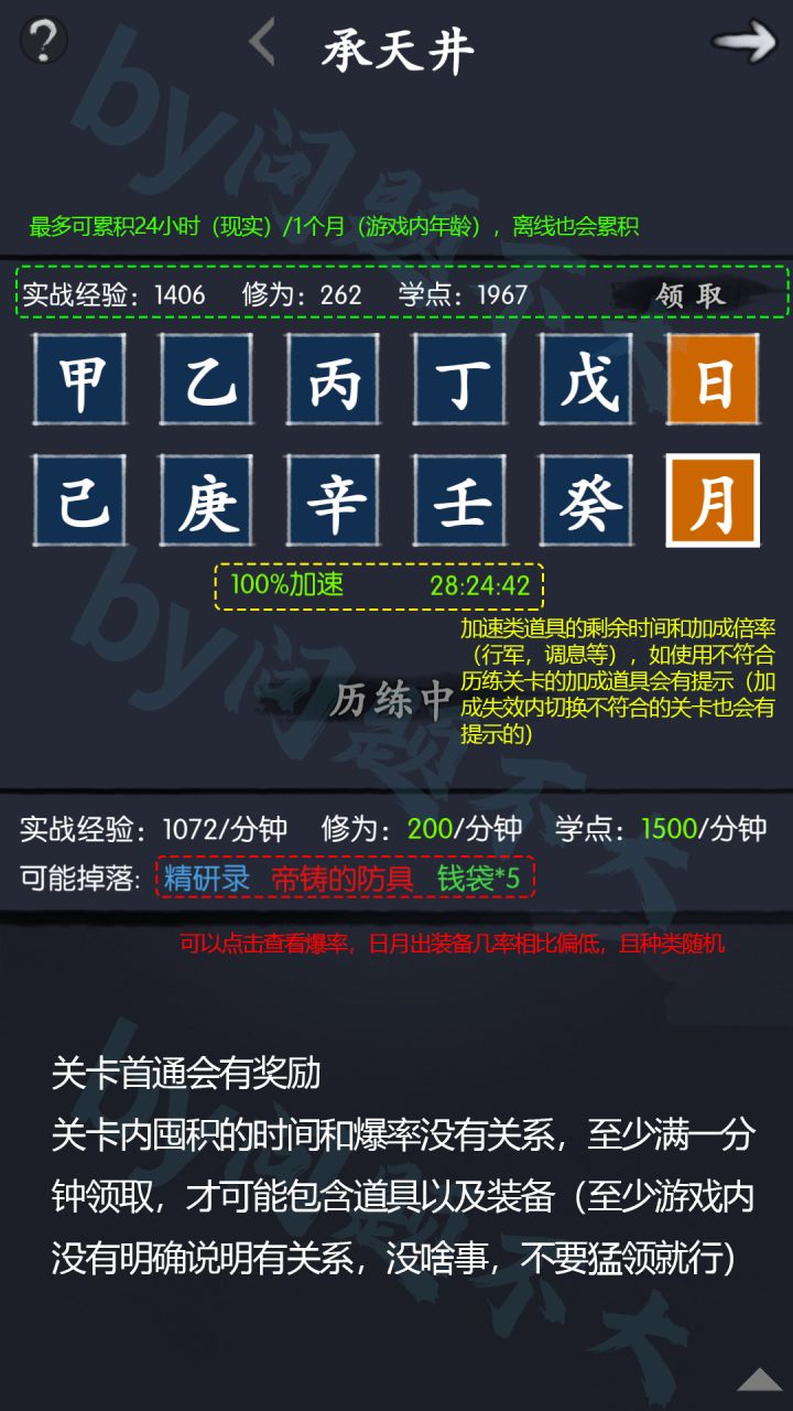 4、类似行军和调息都属于历练挂机收益加成的道具,但对其他道具和装备爆率无效,使用道具时处于不符合道具的历练时/即将切换的历练章节也会有提前提示的