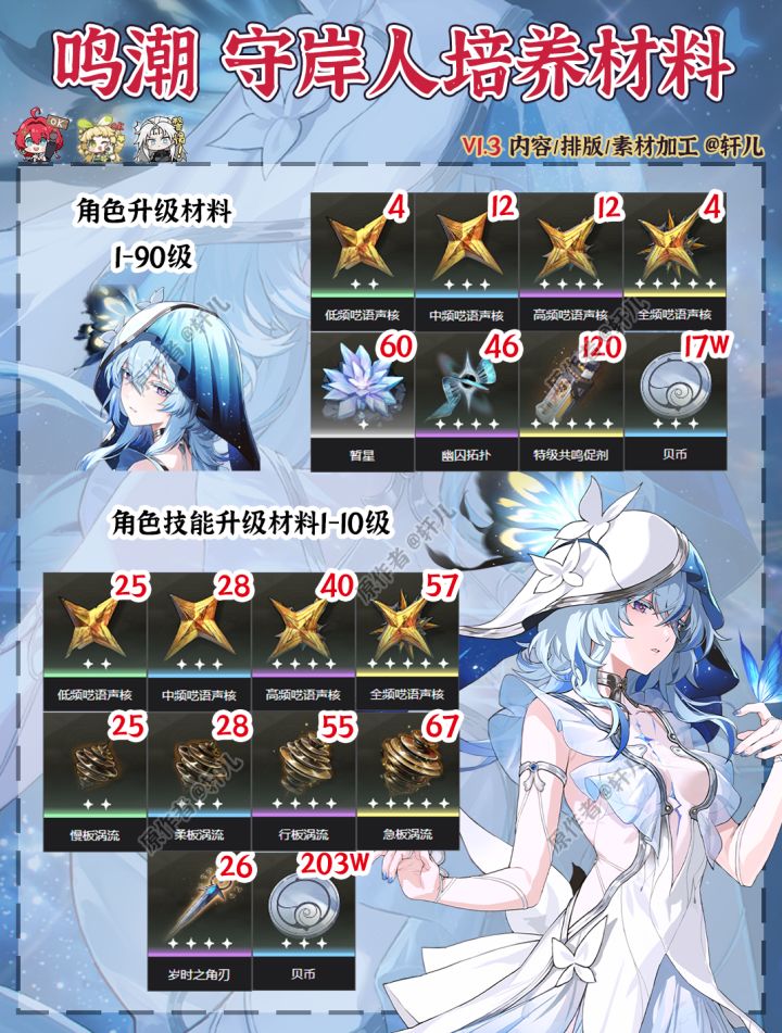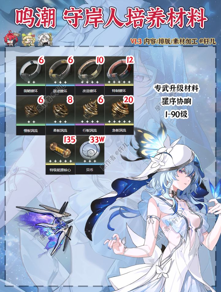 今天是守岸人最后一天,还没有抽到的潮友们抓紧啦,抽到还没准备材料的也可以参考一下~ 之前没有做守岸人的培养材料图 最后一天补一下~守岸人专武/守岸人培养/守岸人材料/守岸人武器/星序协响/守岸人材料