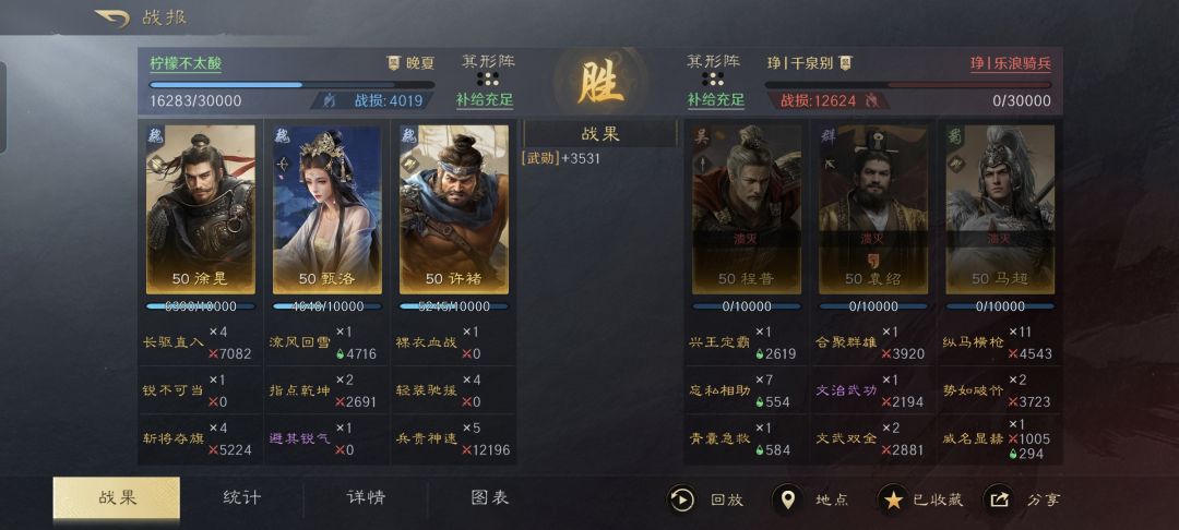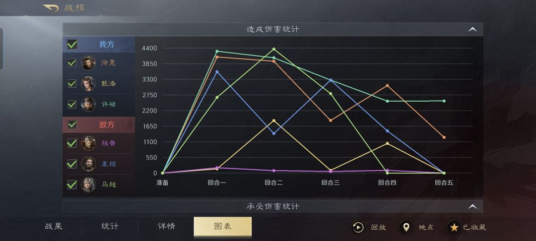 从战报详细的统计图表可以看出,对面的马超和袁绍同样也是双核输出,不过摆在许褚和徐晃的面前,还是差了点火候。