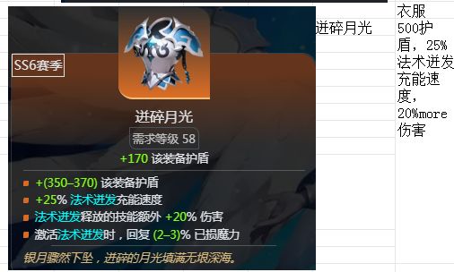 衣服:迸碎月光 500护盾,25%法术迸发充能速度,20%more伤害