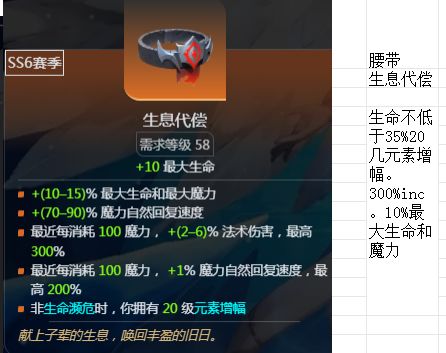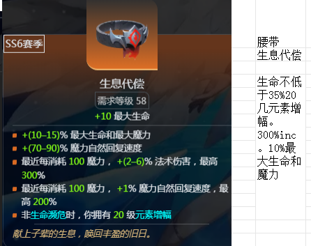 腰带:生息代偿 生命不低于35%20几元素增幅(自己开需要50%魔力封印)。300%inc。10%最大生命和魔力