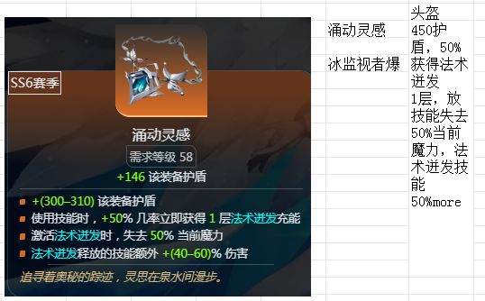 头盔,涌动灵感,应该是法术迸发的核心装备(至少前期是的)450护盾,50%获得法术迸发1层,放技能失去50%当前魔力,法术迸发技能50%more