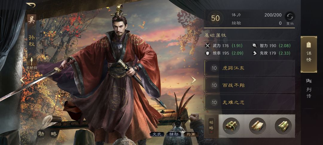 孙权战法:虎踞江东+百战不殆+无难之志。