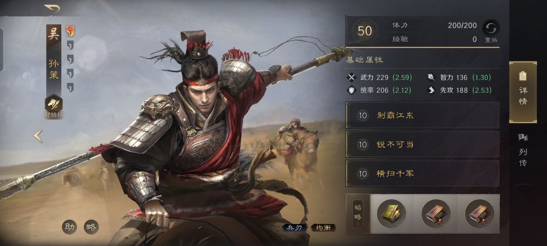 孙策战法:制霸江东+锐不可当+横扫千军。