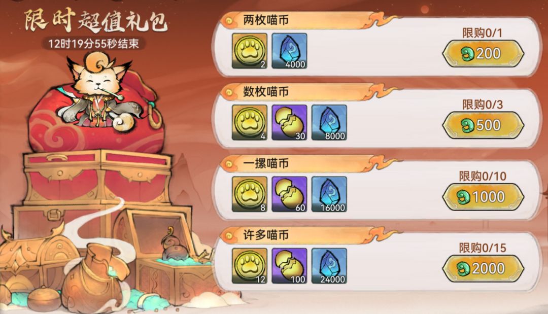 ※除了通过签到赠礼、天书修行获得喵喵币外,祖师还可通过采购灵玉好礼、超值礼包、限时礼包获取,感兴趣的祖师届时可前往了解哦~
