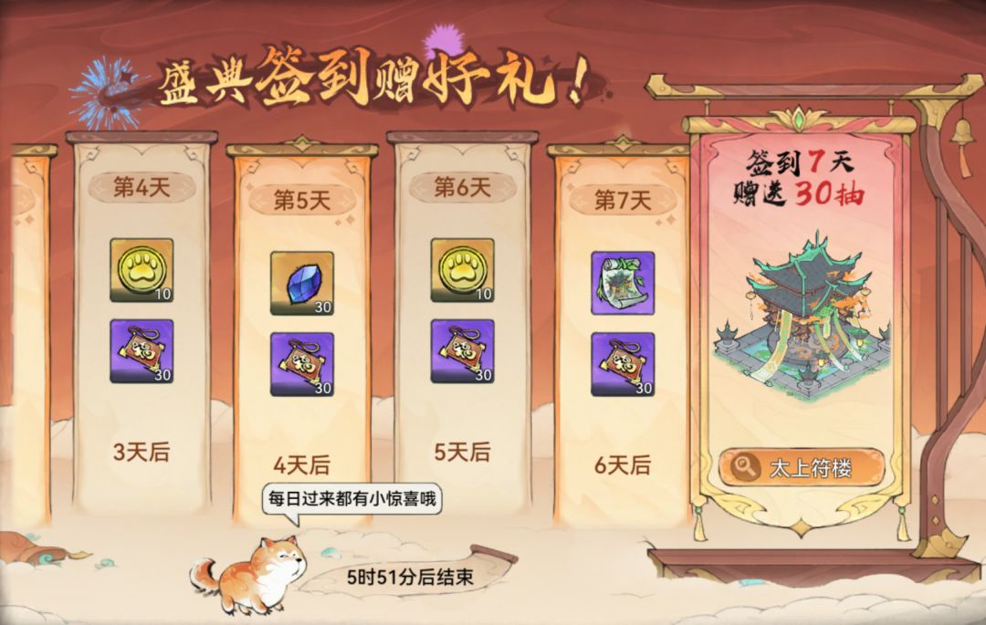 活动期间,祖师完成签到任务即可获得喵喵币、福牌等任务奖励。
