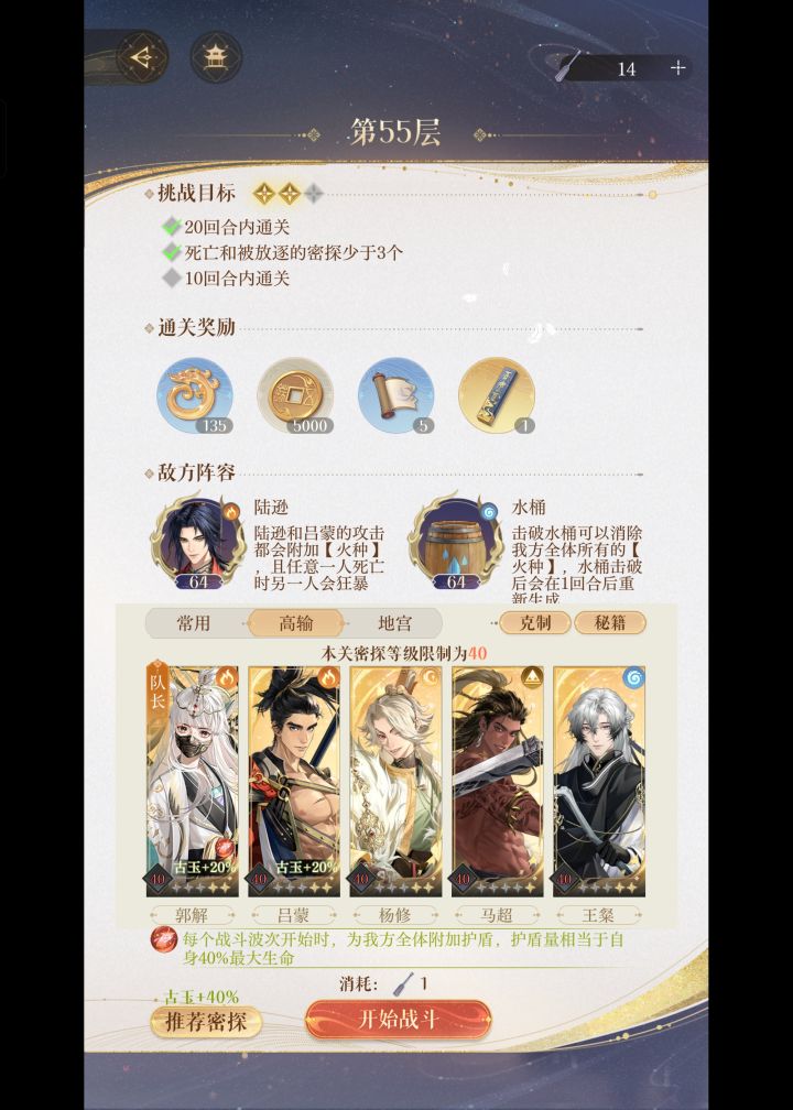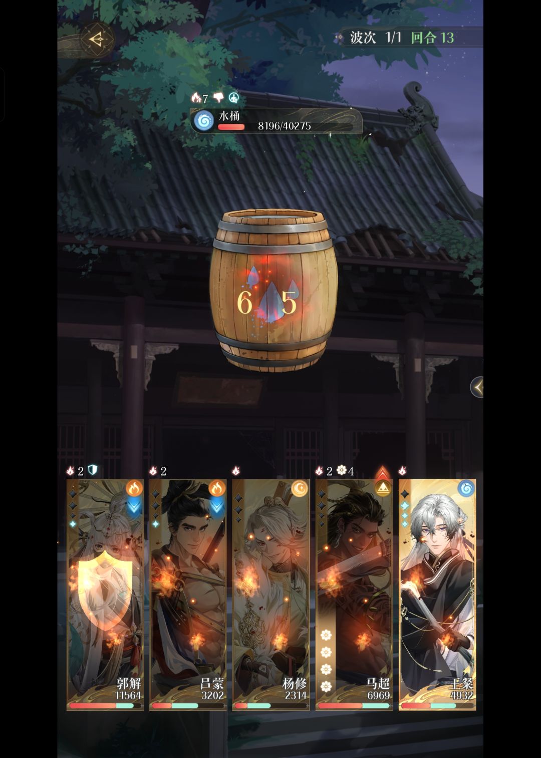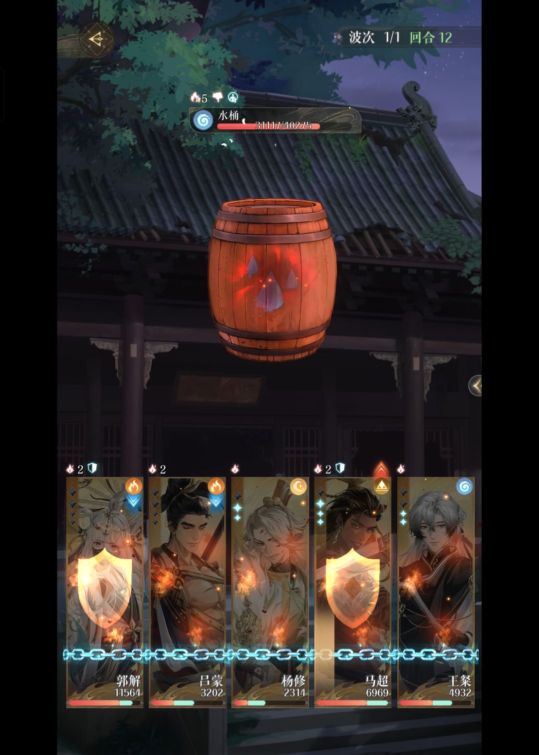 ◇〖火种〗陆逊普攻和吕蒙攻击都会叠火种,一定要注意全员的状态栏,火种叠到3-4时一定要及时打破水桶。我这里用的是马超(土系克制水系),我马超技能+以守为攻足够打破一个水桶,所以我看到水桶血量大概足够我一次打破的时候就会见缝插针去打两下Boss,缓解下输出压力。之前也有用阿婵但效果不是很理想,建议还是用张辽或马超。