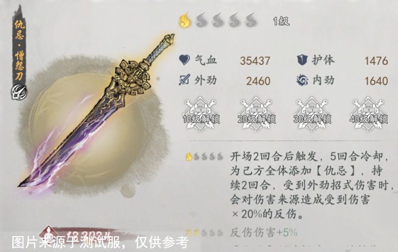 一星效果:开场2回合后触发,5回合冷却,为己方全体添加[仇忌],持续2回合,受到外劲招式伤害时,会对伤害来源造成受到伤害*20%的反伤。