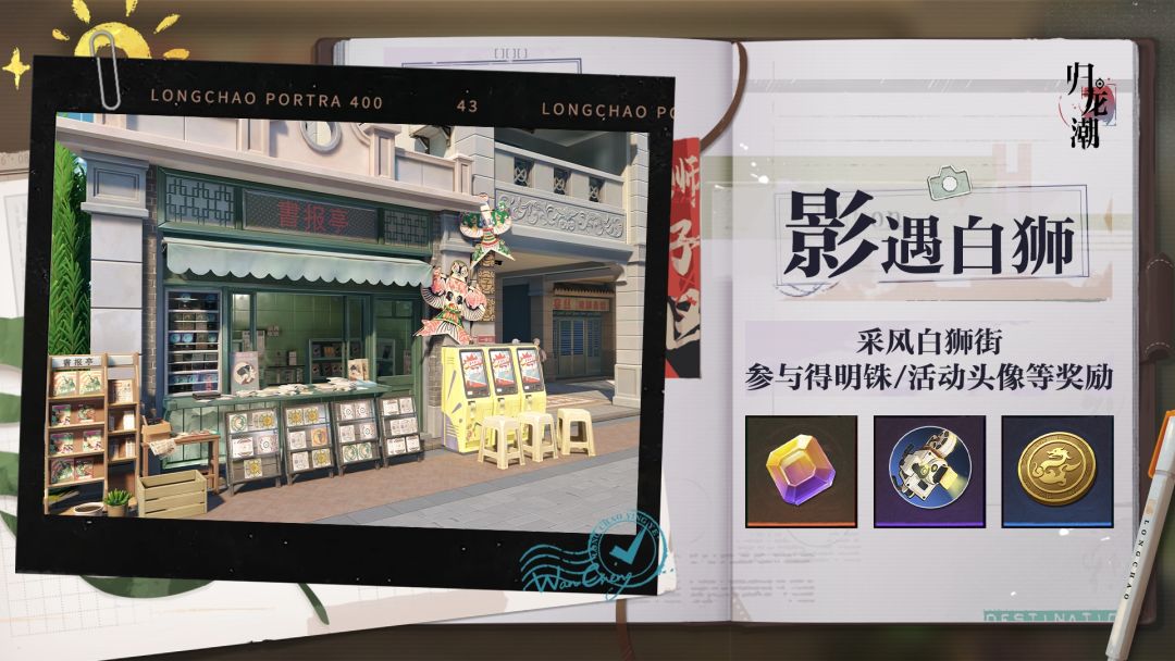与茯苓一同在白狮街采风游玩,根据照片上的线索寻找拍摄目标,成功拍摄后即可领取对应奖励。