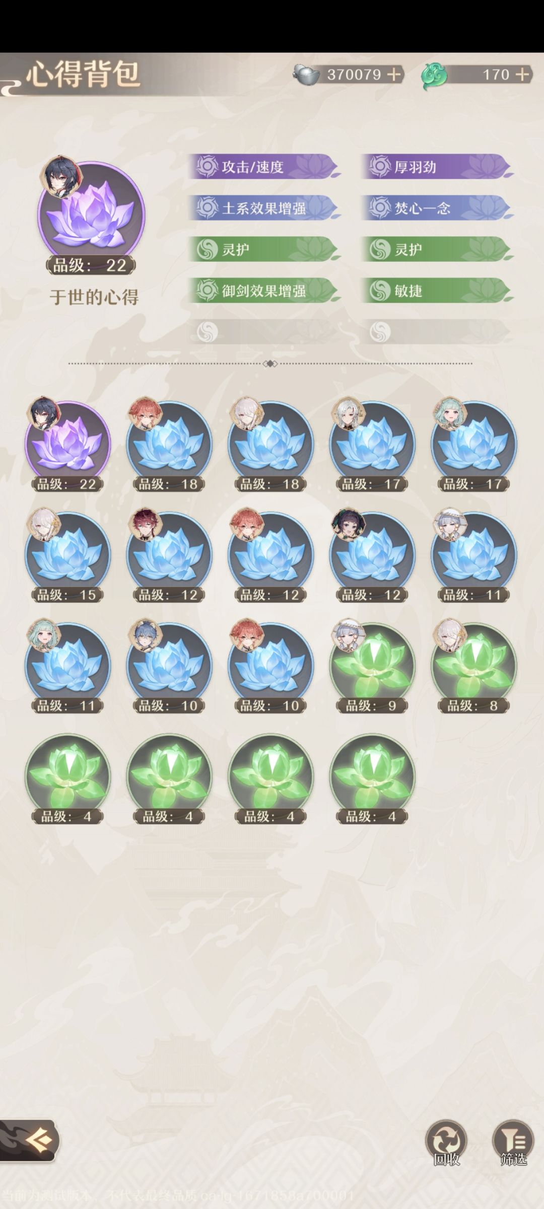 执念卡和炉子等级是养成角色战力的关键,执念卡这一测最后一天如果以全满的等级去刷,这一测不氪金养出元婴后期是肯定没问题的,挑选执念卡要注意功法词条,敏捷+气立或气力+敏捷是最刚需练就一个输出角色的功法词条。