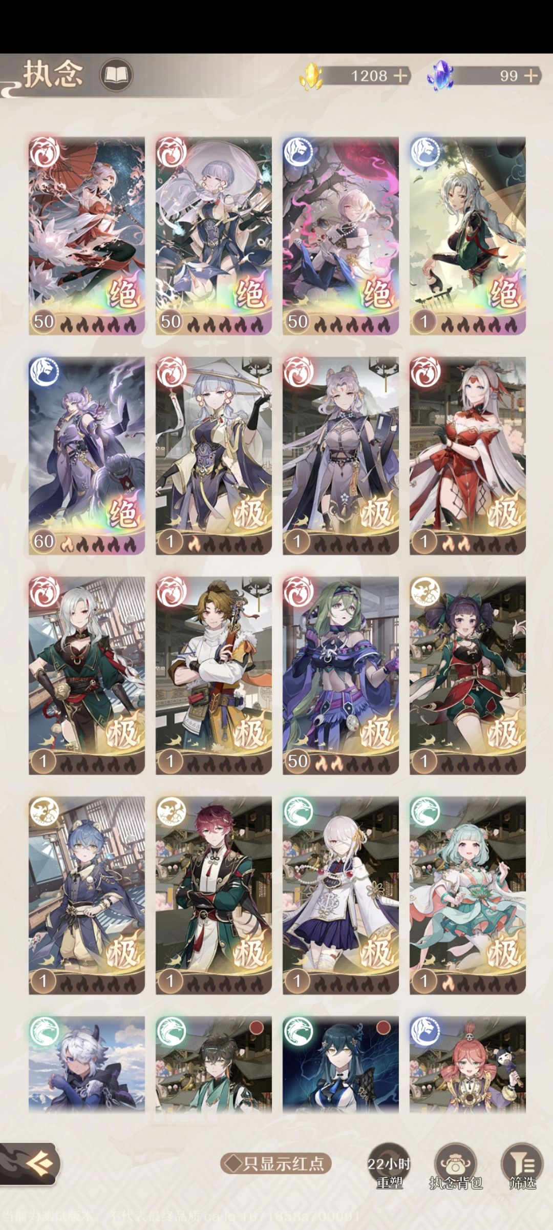 四条属性不分先后,但是对我个人体验来说敏捷>气力>灵护>体质,灵护绝执念相对来说容易获得,本游戏不管前期用什么过渡,后面都会更换成绝品执念卡,极品执念还有待开发,我个人前期还是把四只小雀都拉到50,这一测战力比上一测提升更加容易,丹药一次性获得两枚,额外加了仙宝,执念能升至100级带来的提升更大了,执念的效果也更容易触发。