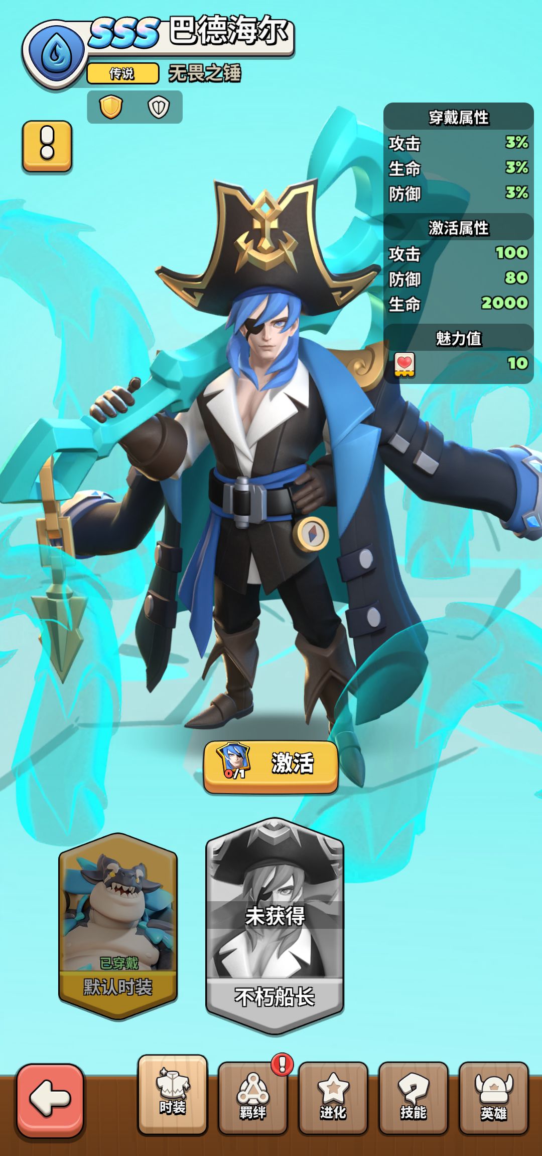 不朽船长,带来的不止是神秘气息。激活这套时装,即刻为全体英雄带来攻击+100、防御+80、生命+2000的全方位属性提升,让每一次战斗都更加势不可挡。