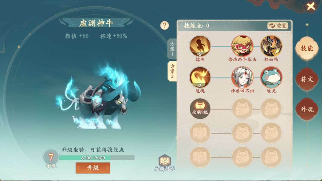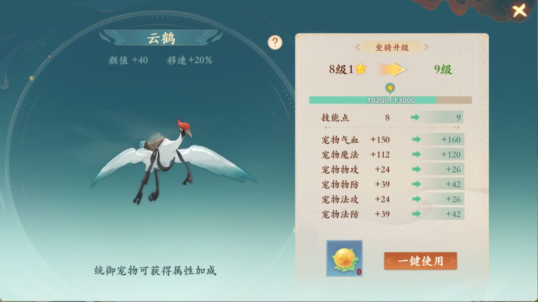 人物等级达到62级开启坐骑系统,获得仙鹤形象,坐骑可骑乘,提升人物移动速度和颜值。养成内容:坐骑(坐骑技能,统御,坐骑等级),符文,幻化。坐骑喂养万灵果可升级,每1级获得1技能点,等级越高统御宠物属性加成越高,一个技能可统御2个宝宝,装配2个符文