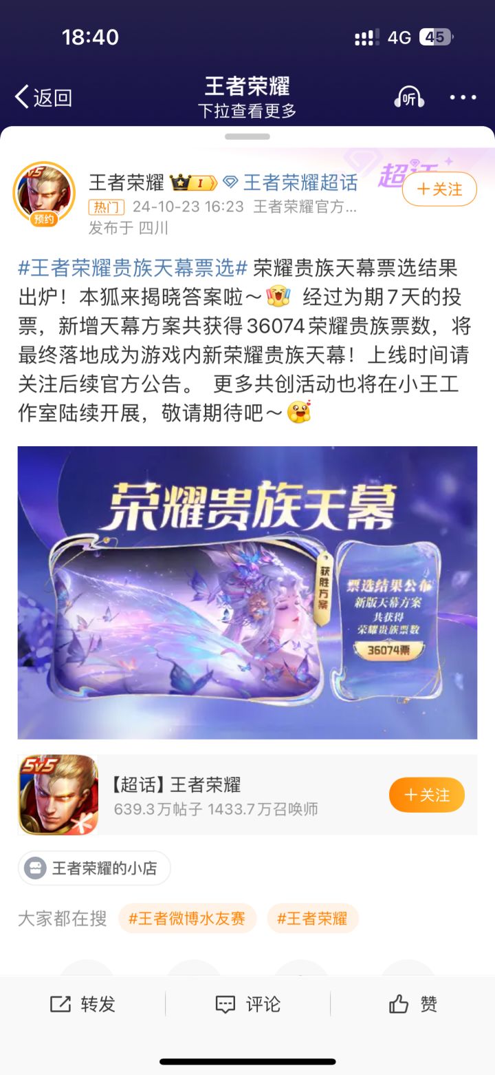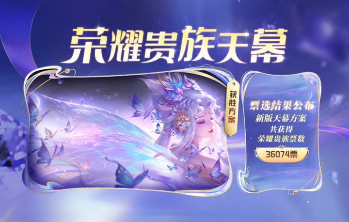 荣耀贵族天幕票选结果出炉!本狐来揭晓答案啦~ 经过为期7天的投票,新增天幕方案共获得36074荣耀贵族票数,将最终落地成为游戏内新荣耀贵族天幕!上线时间请关注后续官方公告。 更多共创活动也将在小王工作室陆续开展,敬请期待吧~ 大觉得这款皮肤怎么样