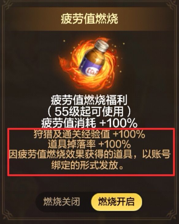 燃烧疲劳值可以提高疲劳消耗速度100%,同时提高地下城道具掉落100%,但因为燃烧疲劳值产生的道具为账号绑定,并且受300疲劳限制。