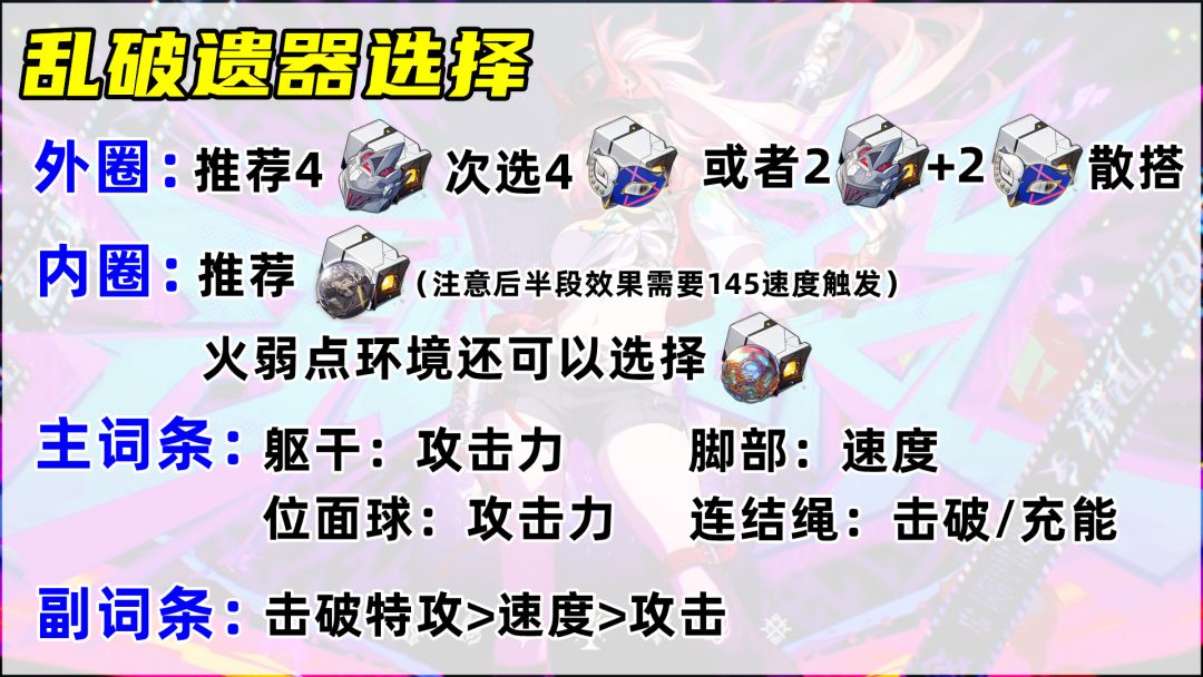 词条方面,主词条推荐:攻击躯干、速度鞋、攻击球、击破绳/充能绳;副词条推荐:击破特攻>速度>攻击。乱破的额外能力之一是敌方弱点被击破时,可以根据攻击力转化为击破伤害易伤,最高3200点攻击力吃满,因此优先选攻击躯干和攻击球。