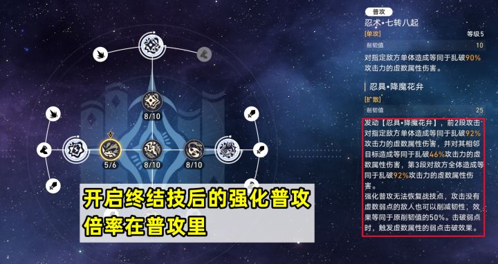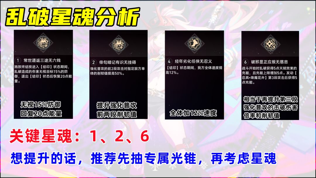 乱破的关键星魂是1、2、6魂。1魂除了无视15%的防御外,还有每轮循环的20点回能。2魂增加强化普攻前两段攻击的削韧值,其实相当于增强了第三段的击破伤害(前两段更容易破弱点)。4魂是结印状态下全队加速12%,相对来说提升没那么明显。6魂则是增加天赋5点充能上限,相当于能让第三段强化普攻的击破伤害倍率额外再加250%(以10级技能计算),以及无视弱点的削韧值提高5点,相当强力。