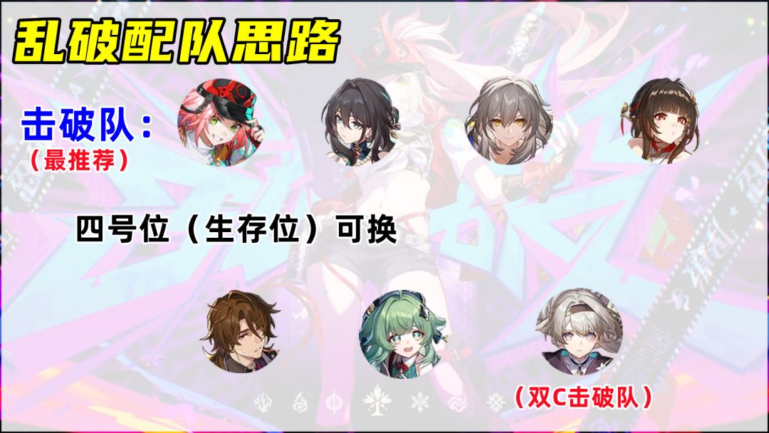 乱破最推荐的配队自然是超击破队,也就是乱破+同谐主+阮梅+灵砂的组合。同谐主和阮梅的位置相对固定,所以想调整配队的话只能从4号位(生存位)着手,比如换成加拉赫、藿藿,又或者在生存压力没那么大的情况下,换成另一位击破C组成双击破配队,比如流萤。