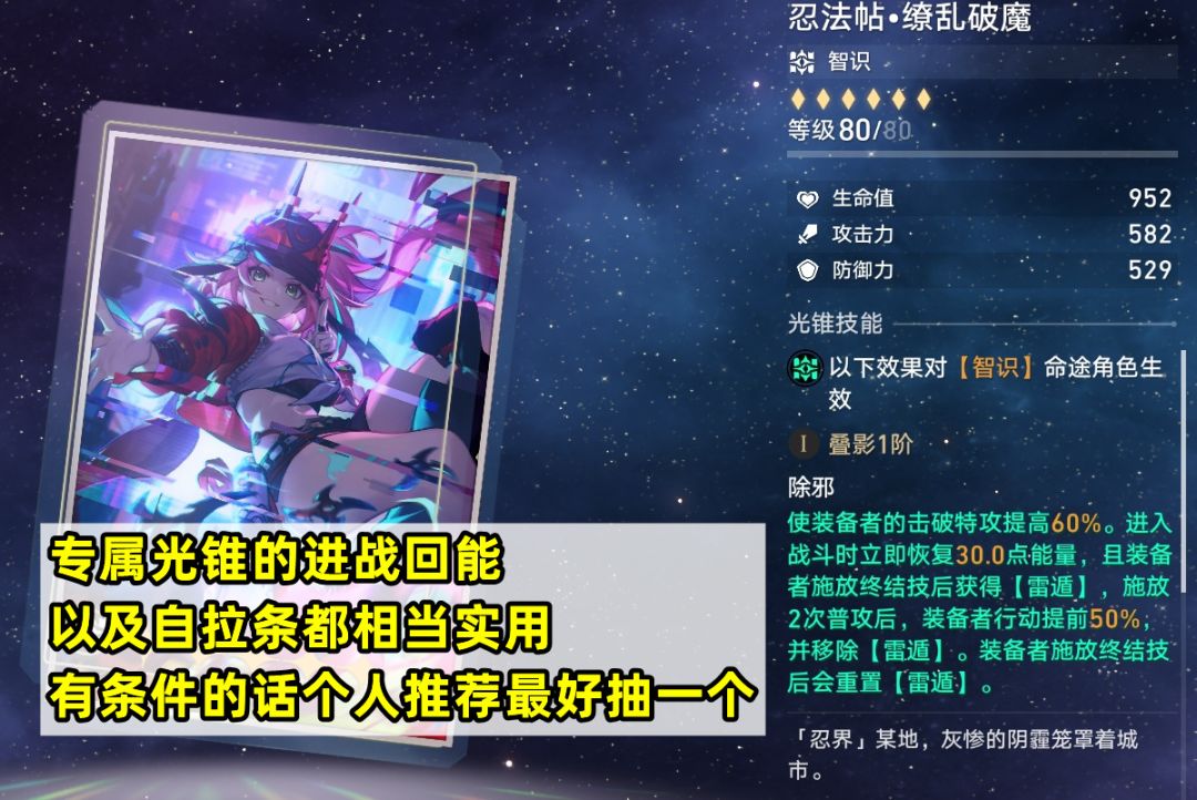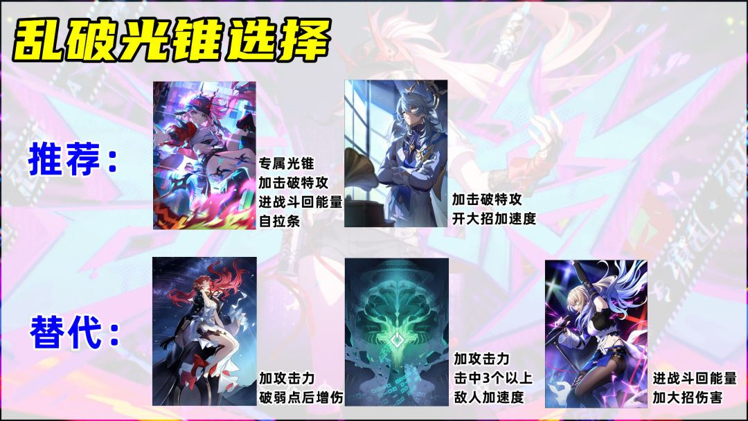 替代光锥方面,因为乱破能将攻击力转化为击破易伤,所以像“银河铁道之夜”以及黑塔商店光锥“不息的演算”也能用。另外进场回能和增加终结技伤害的“别让世界静下来”同样可以考虑。