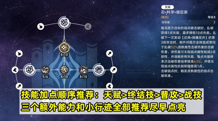 推荐技能加点顺序为:天赋>终结技>普攻>战技。天赋最为重要,升级能提升终结技第3段攻击的击破伤害倍率;其次是终结技,升级能提升击破特攻。开启终结技后的强化普攻是在普攻倍率里的;至于战技升级只能提升对应的直伤,战技的作用更多是用于充能,因此优先级在最后。