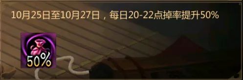 10月25日至10月27日,每晚20:00~21:59期间,掉率提升50%。仙术师们速速掐点上线,抢跑在刷掉落第一线吧!