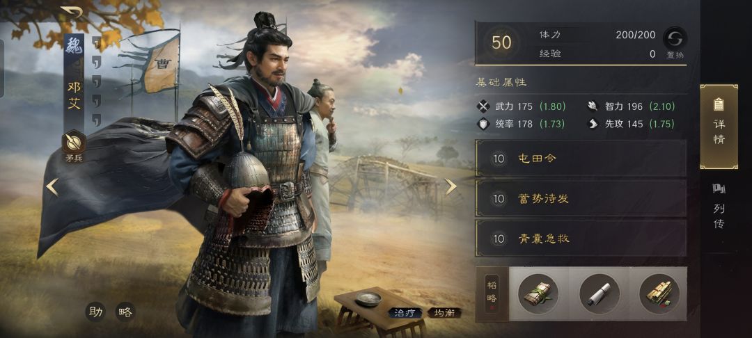 邓艾战法:屯田令+蓄势待发+青囊急救。韬略库:谋战手抄+合谋残章+济河论(专属)。矛兵特性鏖战,专精点亮负坚执锐。贾诩和邓艾联合组成的防线,最大的特点就是既能奶还能乱,确实是相当的恶心人。二者相比之下,值得注意的是邓艾,因为他兼顾了给司马懿叠加伤害和驱散保护的职责。