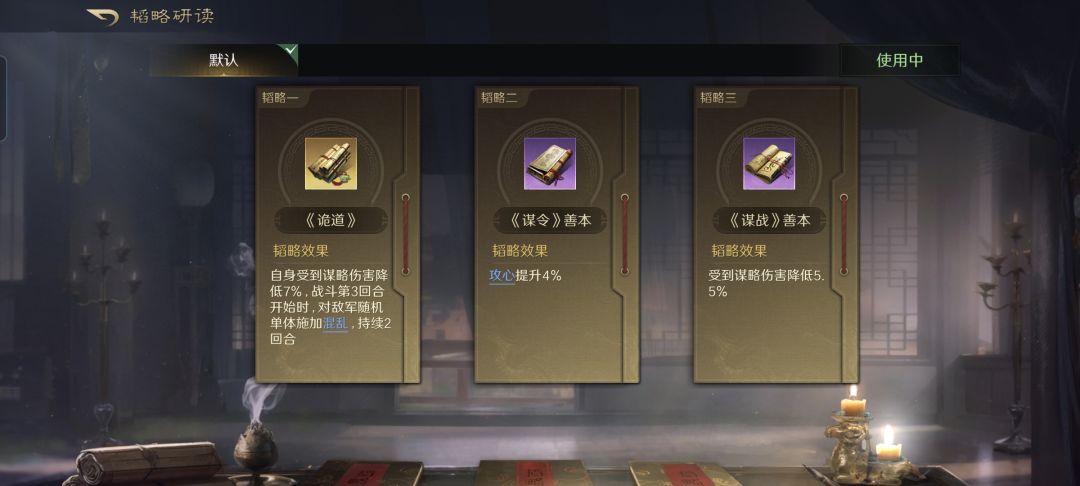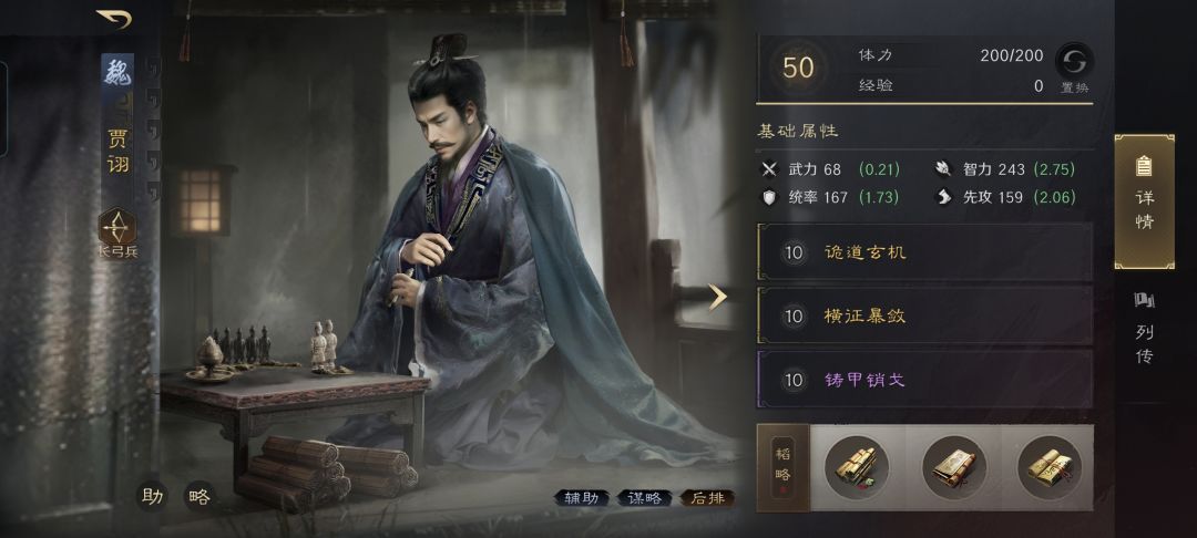 贾诩战法:诡道玄机+横征暴敛+铸甲销戈。韬略库:诡道(专属)+谋令善本+谋战善本。长弓兵特性洞悉,专精点亮谋定后动。