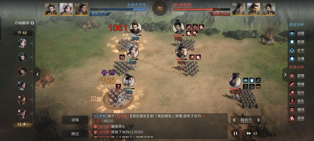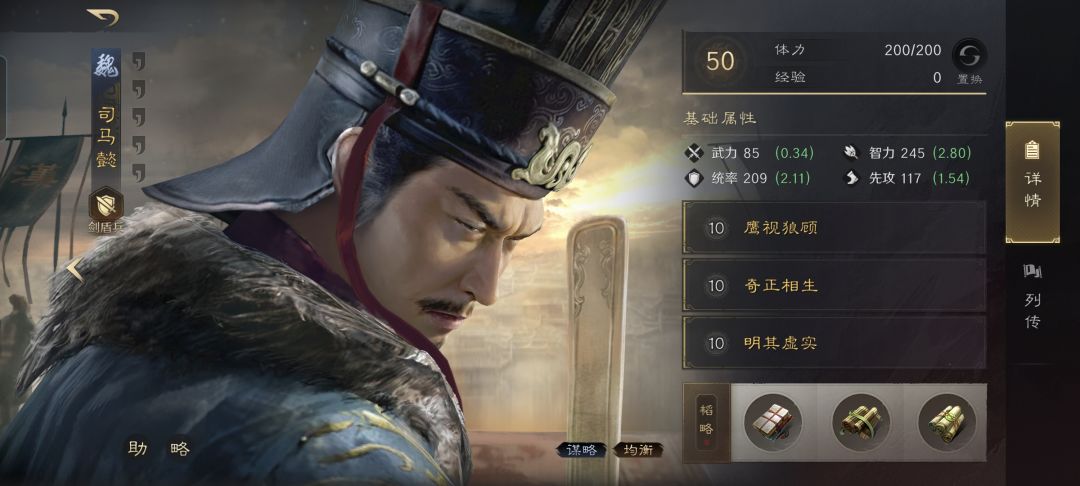 司马懿战法:鹰视狼顾+奇正相生+明其虚实。韬略库:威智善本+略地手抄+大略(专属)。剑盾兵特性专注,专精点亮浴血奋战。身处雁形阵后排的司马懿,吃到了非常高额比例的伤害量提升,层层布局的慢热和明其虚实的智力、统率夺取,是他能够打出全场最高伤害的根本保障。