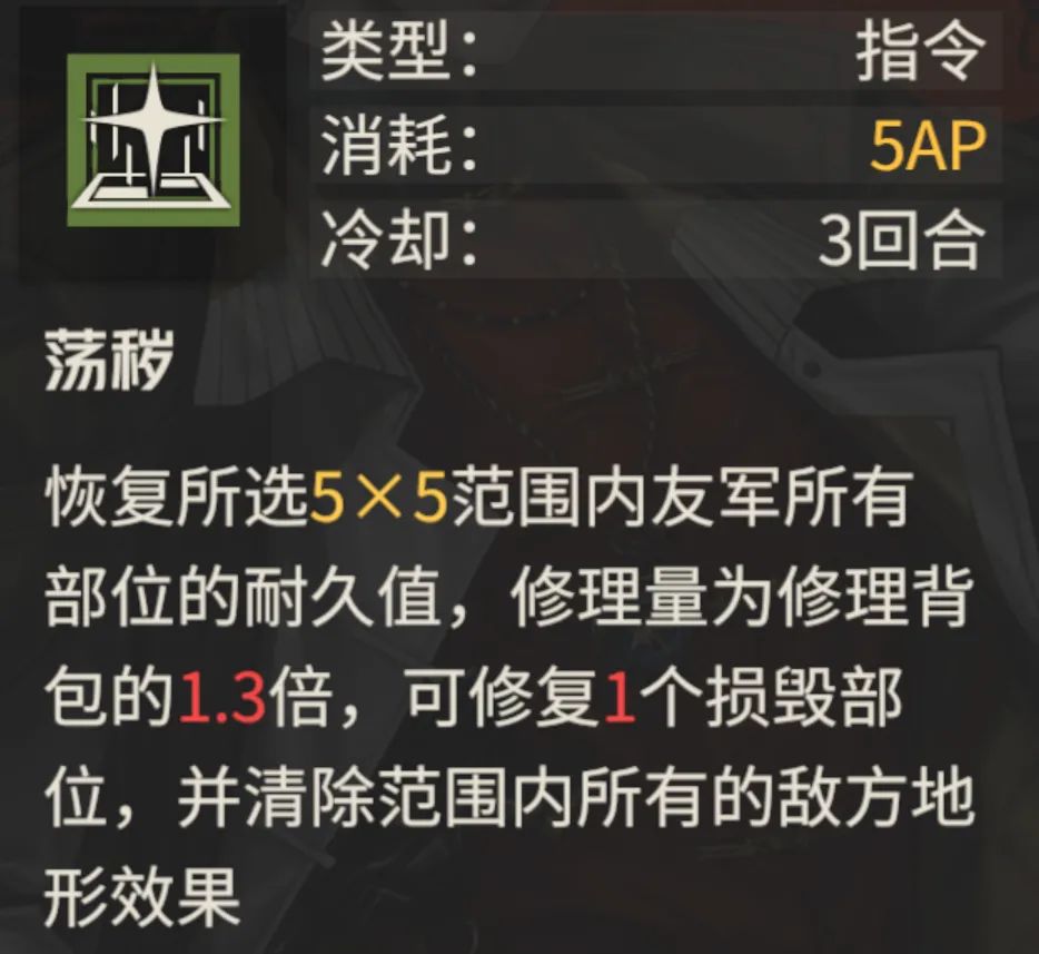 最后一个功能则是【荡秽】技能所提供的清除5×5奶技范围内的所有敌方地形效果,这个技能更多就是一个PVP类型或对策卡类型的技能了,目前例如在14-3的芯片本中就能起到部分降低关卡难度的作用,大家可以略作参考。