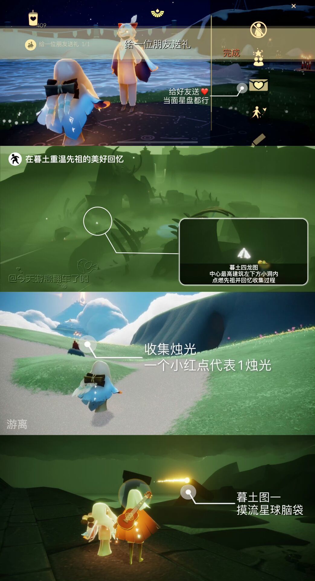 《光遇》游戏中每天的每日任务及大蜡烛的位置都不相同,玩家完成每日任务及收集大蜡烛都可以得到丰厚的兑换奖励,奖励可以用于兑换各种动作及道具,不过很多小伙伴不知道每日任务怎么做,又懒得自己去找大蜡烛的位置,我们汇总了每日任务的完成攻略以及蜡烛位置,一起来看看吧!