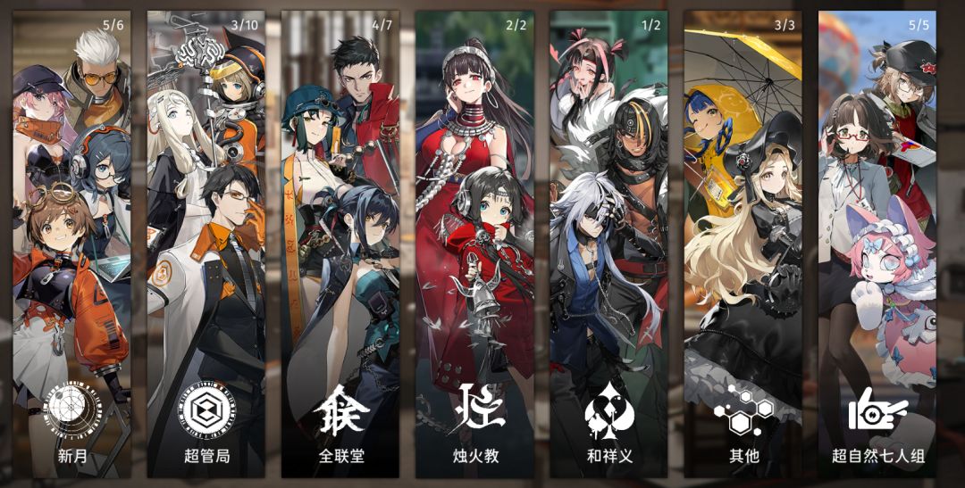 角色分为7个派系,新月(被通缉的超管局的小队),超管局(超自然现象管理局,游戏最强部门),全联堂(半黑半白的南延本土势力,历史悠久),烛火教(神秘教团),和祥义(南延新星本土势力),超自然7人组(来整活的7人小队,最主要的作用是围炉夜谈)。