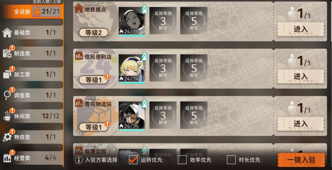 升级顺序:基础类>加工类>调查类>制造类>物资类=经营类>休闲类