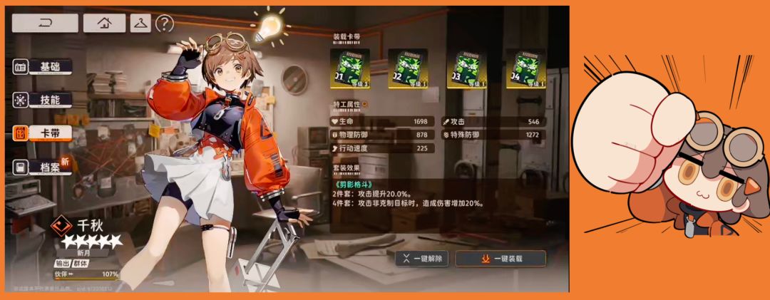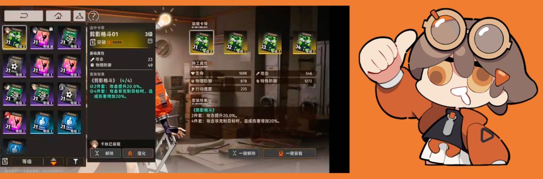 前期要是想让战斗力大幅度提升,为千秋准备一套剪影格斗就行,剩余几个角色搭配多个2件套就够用了。很多玩家就是因为不重视卡带,所以才会在剧情任务中被敌人按在地上摩擦。