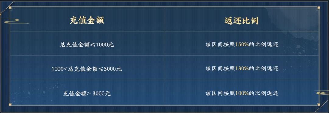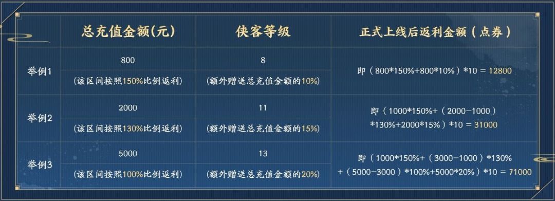 2、游戏公测后少侠可参与“充值返还”活动将先锋服中同一账号【返利最高角色】的对应点券额度领取至正式服(突破服、经典服)的同账号角色;同账号不进行多角色累计充值计算。