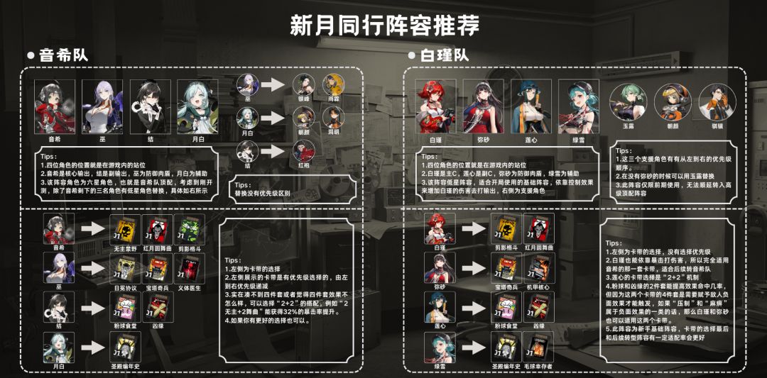 核心为音希,音希打双暴伤害非常高,如果有条件或者前期抽到了音希的话值得一练。